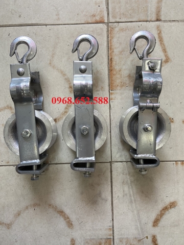 Móc treo ròng rọc kéo cáp: loại móc dạng hai bản dẹt đặt song song, có lỗ xỏ để dùng đinh vít cố định, có khớp nối động với puly, đảm bảo ròng rọc nhôm kéo dây điện, cáp điện làm việc được với nhiều hướng.