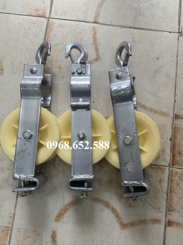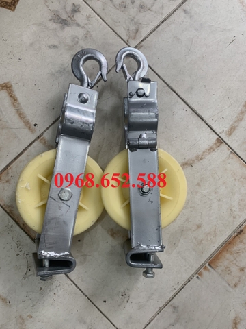 Móc treo ròng rọc kéo cáp: loại móc dạng hai bản dẹt đặt song song, có lỗ xỏ để dùng đinh vít cố định, có khớp nối động với puly kéo dây, đảm bảo ròng rọc nhựa kéo dây điện, cáp điện làm việc được với nhiều hướng.